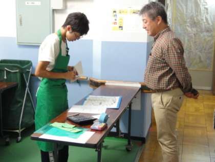 写真左側は,呉竹生徒が水曜日と木曜日の13:00頃に本校教職員から衣類を受け取る「呉竹クリーニング」の様子です。受付マニュアルや料金表を見て受付をしています。分からないことがある場合は,丁寧な言葉遣いで指導者に支援を求めることも学習です。