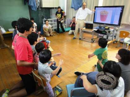 ALT(AssistantLanguageTeacher:外国語指導助手)が今年度も勤務を始めています。今日は小学部4年生の子どもたちと英語にチャレンジしました。pizza,juice,popcorn〜等々と大型テレビの画面の写真とともにテンポよく繰り出される英語に,子どもたちはノリノリ!!英語の世界を楽しんでいました。