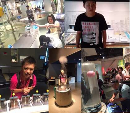 見て聞いておもしろい装置がたくさんで,みんな興味深々!実際にボタンを押したりハンドルを回したりする実験展示もいろいろあって,それぞれが楽しめました。夢中になってくり返しチャレンジする人も!良い学習ができました!