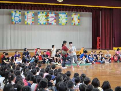 小学部では,京都市立桃山小学校と年間を通じて “学校間交流” (交流及び共同学習)を行っています。今日は桃山小学校での「6月の集い」に呉竹の1〜6年の児童が参加してきました。呉竹の児童の紹介後,「妖怪体操第一」をみんなで踊ったり,桃山小学校のみんなが「世界中の子どもたち」「世界がひとつになるまで」歌ってくれたりしました。まだまだお互いに関わり方が分からなくて遠慮がちな場面も見られましたが,少しずつ打ち解けてお互いに笑顔になる場面も見られました。今回を初回に,様々な形で年間を通じて桃山小学校と学校間交流をしていきます。お互いの児童にとって学びの多い機会となればと思っています。