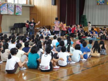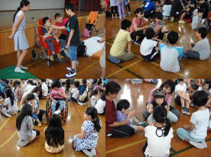 桃山小学校での「6月の集い」の後,桃山小6年生と中間休みの時間帯を一緒に過ごし,その後,桃山小5年生と「なかよし交流」をしました。「くだもの狩りへ行こう」のゲームでは,同じグループになった人同士で名前や好きなものの紹介をしたり,握手をしたりして交流しました。桃山小の子どもたちは,少しずつ距離を縮めようと様子を見ながら優しく関わってくれていました。授業開始・終了時には,呉竹の子どもたちが使っている「はじめます」「おわります」のマカトンサインを一緒にしたのですが,「おわります」の挨拶と同時に「まだ終わりたくない!」とばかりに泣き出す呉竹の児童もいた程でした。