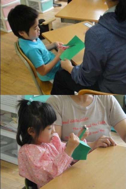 はさみを使って切る,手でちぎる,はんこを押す,マーブリングをするなどの手法で造形活動をしました。先生とゆっくり関わりながらの活動を楽しんでいました。