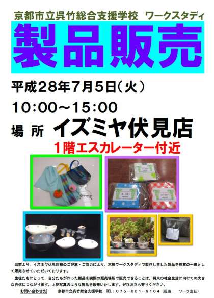 イズミヤ伏見店様のご好意・ご協力により,本校ワークスタディで製作した製品を授業の一環として販売させていただきます。生徒たちにとって,自分たちが作った製品を実際の販売場所で販売できることは,将来の社会生活に向けての大きな自信につながります。ぜひお立ち寄りください。