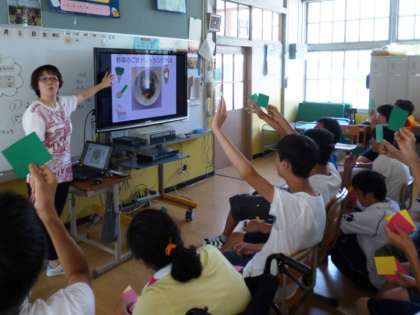 本日の学年活動で本校の栄養教諭をゲストティーチャーに迎え,「食育」をテーマに学習をしました。まず,食べ物は,赤色・黄色・緑色に分類することができ,それらは体をつくったり,エネルギーのもととなったり,体の調子を整えるもととなったりすることを学びました。そして,今日の給食のメニューから,赤色・黄色・緑色の食べ物はどれかというクイズもしました。クイズを通して,給食が栄養のバランスを考えて作られていることが分かりました。赤・黄・緑の視点で栄養バランスを整えていくことを日々の生活にも生かしていきたいです。