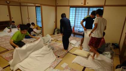 起床後,シーツや布団の片づけをしています。