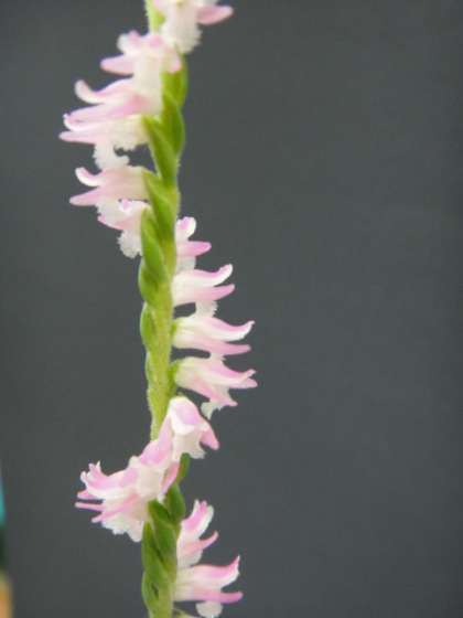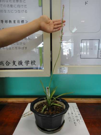 校内に自生している「ネジバナ」を本校教員が見つけ,鉢植えにして正面玄関に飾っています。その名の通り花の部分が“ねじ”のようにねじれていて,とてもかわいらしい花です。ご来校の際は是非注目してみて下さい。