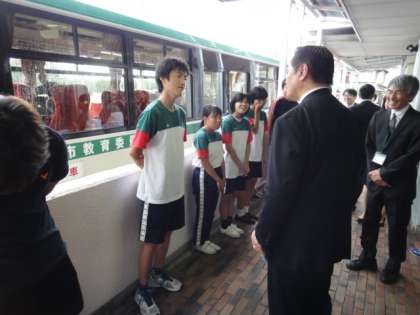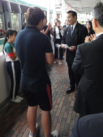 最後に,児童生徒会本部役員がワークスタディの製品をお土産としてお渡しし,お見送りをしました。