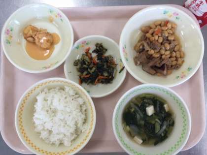 7月19日の献立は,「ごはん・牛乳・豚肉と大豆の中華煮・えびマヨ・とうふと青菜のスープ・大根葉とにんじんのごま油炒め(中高のみ)」でした。