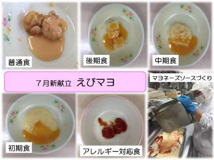 えびマヨは,7月の新献立です。ふんわりと揚げたえび天に,マヨネーズ・トマトケチャップ・ヨーグルト・水あめを混ぜ合わせて作った色あざやかなソースを教室でかけて食べます。「ソースがおいしかった」「もっと食べたかった」と好評な意見が出てきました。