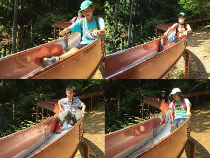 アスレチック班は「ぼうけんの砦」へ!忍者が登るような板を登ったり,吊り橋を渡ったりして,お楽しみのロングローラー滑り台へ。みんな良い顔でした。