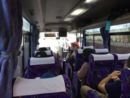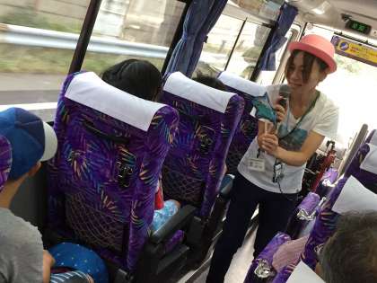 バスは快調に名神高速を走っています。土砂降りだった雨もやみました。今は楽しいレクレーション中。修学旅行クイズで盛り上がっています!