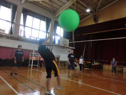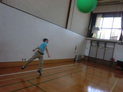 昼休み,高等部の生徒たちが体育館で大きなボールを使って,楽しく汗を流していました。