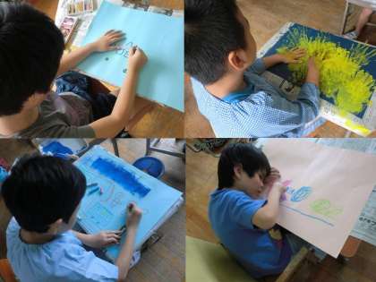 今日の造形遊びは,自由画です。子どもたちが思い思いに描いていました。