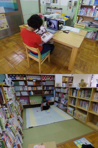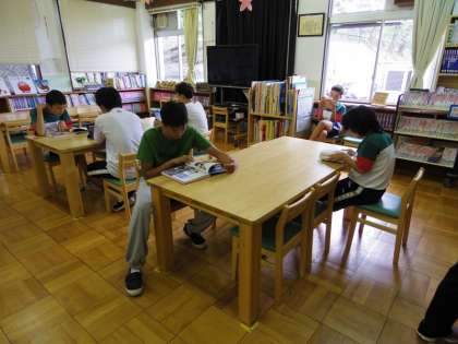 給食を食べ終え,お楽しみの図書室タイム。自分のペースで,自分の好きなエリアで,絵本や漫画,本,DVDなどを楽しんでいます。
