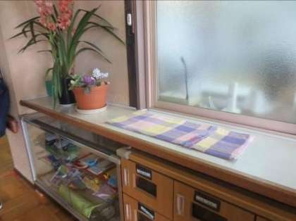 高等部ワーク布加工班で敷物を織り縫製し,玄関の靴箱上に設置しました。春らしい淡いピンクや紫の“さをり織”の敷物です。さらに,その敷物の上に,中学部ワークスタディC班が製作した木製コースターと,中学部ワークスタディD班と高等部ワークスタディ農園芸班で栽培・製作したセダムの植木を飾っています。玄関で春を感じてもらえたらうれしいです。