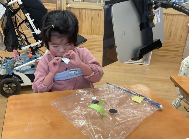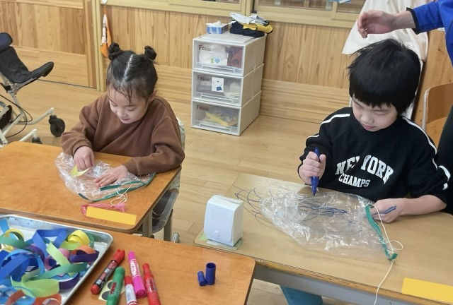 凧あげとは「みんなの健康と悪いことが起こらないようにと願う遊び」と話を聞いた後、一人一人ビニールの凧を作りました。