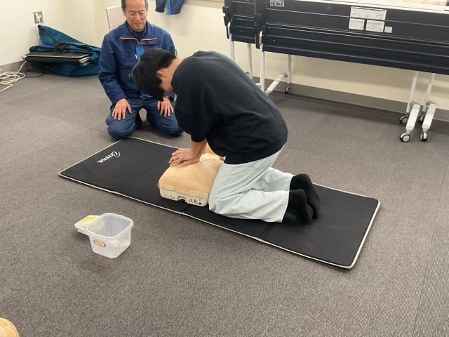 胸骨圧迫の正しい仕方や、緊急時の対応の流れについて説明を受けた後、実際に人形や練習用のAEDを使用しながら実技に取り組みました。