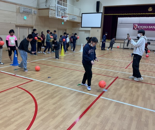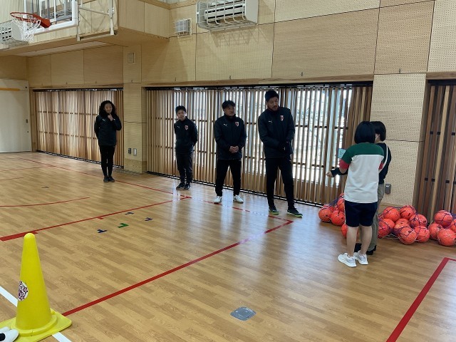 「京のスポーツ夢バンク」事業で、京都サンガF.C.のコーチ4名に来ていただき、サッカー教室を行ないました。