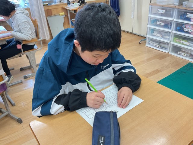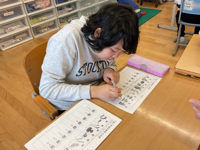 手先の巧緻性を高めるために紐通しをしたり、基礎学力の向上のためにプリント学習をしたりしています。
