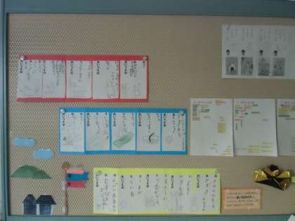 京大分教室の小学部の掲示板には,1年生国語の授業で作った「あいうえおのうた」を掲示しています。