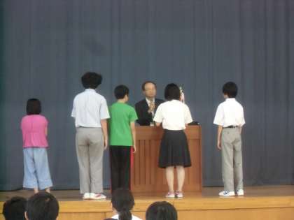 はじめに学校長より夏休みの振り返りと、9月・10月に行われる学校行事の取り組みについてお話がありました。続いて7月に行われた「第28回京都市総合支援学校交流会 卓球バレー」の表彰がありました。本校から参加した3チームにそれぞれ賞状やトロフィーが渡されました。最後に児童生徒会から桃陽祭のスローガン募集について説明があり、みんなで力を合わせて桃陽祭を作り上げましょうとメッセージがありました。