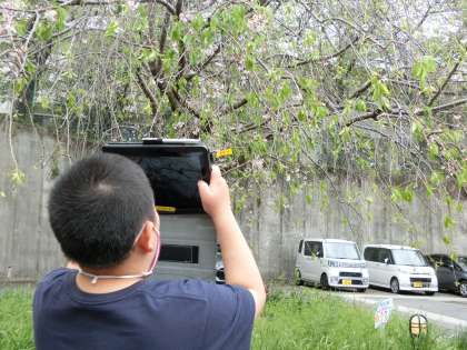 本校と分教室を繋いで,「春の始まりを探そう」をテーマに理科の授業を行いました。教室から外に出てみると,たんぽぽやチューリップ,桜にテントウムシなど,たくさんの「春」があります。本校を歩き回る中で,小さな花も見逃さずに写真におさめたり,見つけた「春」をみんなに指さしで教えてくれるなど,春探検を楽しむ児童の姿が見られました。「これは何かな〜?」と,先生が写した「春」に,分教室の子どもたちは「よもぎ?」と答えたり,「さくら」と文字にして打ち込んだり,本校と分教室で一緒に「春」を共有し,楽しむことができたようです。