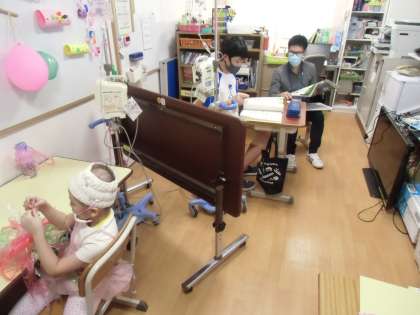 市立分教室わかば学級の児童生徒は,毎日いろいろな授業に取り組んでいます。小学部では,算数で使った空き箱等を使ってロボットや家を作ったり,運動会の応援グッズを作ったりしました。中学部では,ベッドサイドからALTの先生の授業に参加したり,教室で英語の授業に取り組んだりしました。どの授業も,じっくり考えてたくさん発言して,頑張っています。