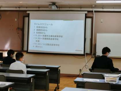 本校中学部と分教室中学部とをつないで、高校の先生方にお越し頂いて、直接高校の先生から話を聞く会を設けました。中3生は背筋を伸ばして話を聞いていただけでなく、自ら手を挙げて質問したりもしていました。高校の特色、制度、部活動、高校卒業後の進路先など話は多岐に渡りましたが、どの先生も共通して、「中学生により良い人生を送ってほしい」「自分に合う学校を見つけてほしい」という熱い気持ちが伝わってきました。