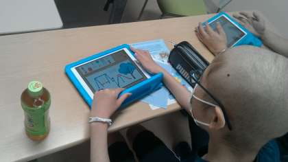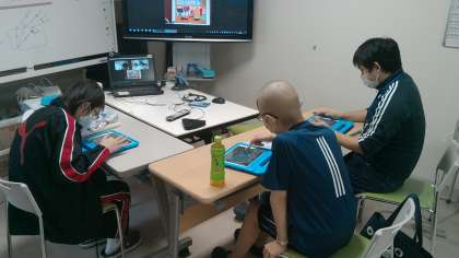 前回の小学部に引続き今回は府立中学部での絵本作りです。参加は2名でしたが、さすが中学生ということでipadの操作は手慣れたもので講師の先生からの説明を聞くとすぐに絵本作りに取りかかっていました。呑み込みの早さを見て、他の学校の生徒が英語で作った絵本を講師の先生が紹介してくれました。それに負けないよう府立の中学生たちもいろいろなアイディアを出しあいながら絵本作りに取り組みました。出来上がりが楽しみです。
