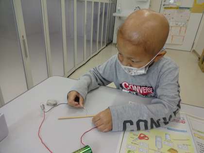 京大分教室では,「電気の通り道」の学習をしました。電気を通すものと通さないものを予想し,回路の途中に調べたいものをはさんで,豆電球に明かりがつくかどうかを調べました。木でできた割り箸は,電気を通さないことがわかりました。予想したことを調べる実験は楽しいですね。