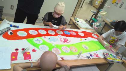 登校した小中学生みんなでスローガンを作っています。柄を描いたり色を塗ったりしながら楽しくスローガン作りをしました。全校集会での発表が楽しみです。