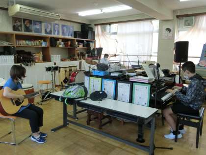 本校では、毎週金曜日が課外活動の日となっています。運動部では教職員と一緒にバスケットボールでミニゲームをしたり、音楽部では自分で好きな曲を選び、楽器演奏を行っています。週に1回なので、児童生徒も楽しみにしています。