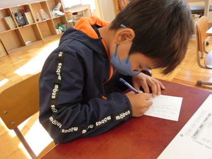 小学4年生の国語の授業で「好きな行事の楽しさを知らせる手紙を書こう」という学習の一環で、初めてはがきを書きました。もうすぐ行われる学習発表会で頑張ることを伝える内容を考えました。普段書き慣れていない漢字も挑戦し、集中し最後まで丁寧な字で書きあげることができました。「いつ届くかな?」と楽しみにしながらポストに投函しました。