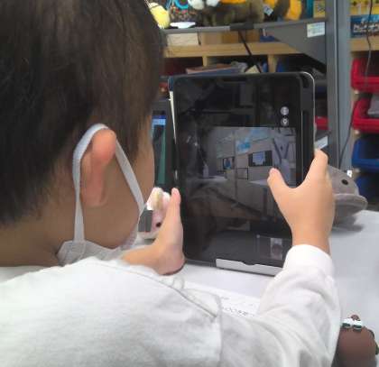 学習発表会の日の午後は展示作品を鑑賞する時間です。分教室からアバターロボットのkubiとtemiを使い、自分の手元のiPadを操作して見たい位置にある作品をいろいろな角度から眺めることができました。児童生徒は展示会場にいる先生のサポートも受けながら楽しく鑑賞することができ、用意した作品鑑賞シートに感じたことをまとめていました。