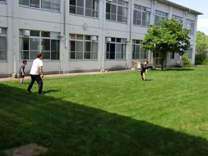 日差しが降り注ぎ、緑が映える芝生で休憩時間に小学部の児童たちがドッヂボールをしています