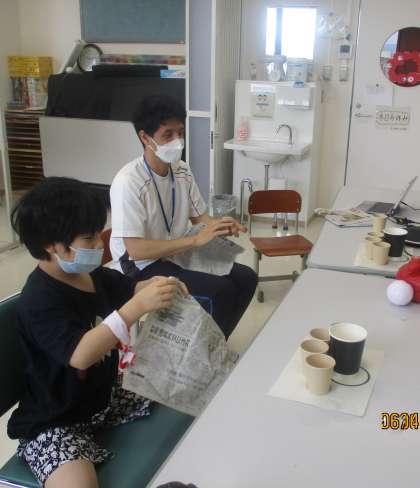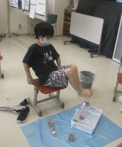 分教室では、玉作り玉入れ、ペットボトル足つかみ、風船ぽんぽんなどの競技に取り組んだ後、本校との合同競技でジェスチャーゲームをしました。