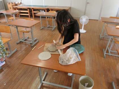 途中、粘土が固くなってくると水をかけて柔らかくしていました