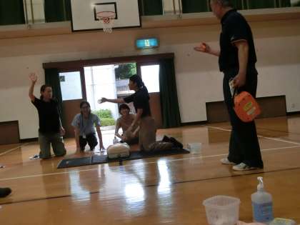 京都市伏見消防署の方のご指導のもと、人が倒れている場合を想定して、胸部圧迫・AED活用法等を教えていただきました
