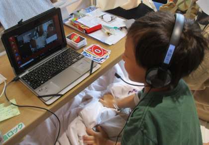 京大分教室では、学活の時間に分教室とベッドサイドで学習している子どもとをリモートでつないでカードゲームをしました。
