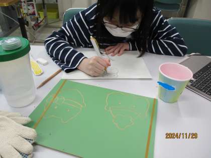 「冬」をテーマに書いた下絵をカーボンで板に写しとり、彫刻刀で丁寧にほっています。