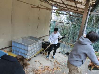 先生たちと協力して廃棄廃棄物収集場所にあった落ち葉を集めて、きれいにしてくました