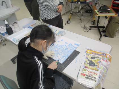 5年生は彫りすすみ版画で、彫る→色をのせて刷る→彫るをくりかえし、すすめています。