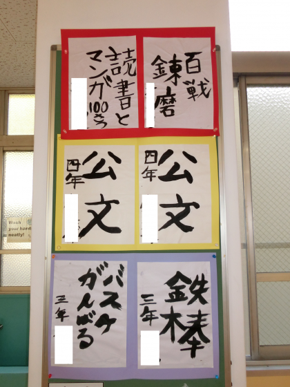 本校小学部の廊下に書き初めが展示されています