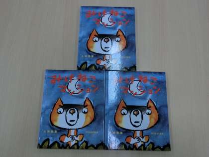 日本新薬株式会社様から第16回日本新薬こども文学賞の最優秀作品から制作された児童用図書「みけねこマンション」(3冊)を寄贈していただきました