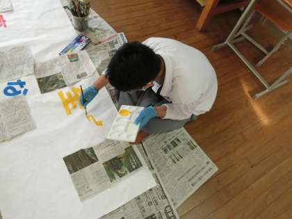 放課後、本校の児童生徒会のメンバーで学校スローガンの垂れ幕づくりをしました