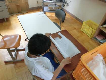 先日の運動会の際に使用した靴袋(ビニール袋)を1枚ずつたたみました