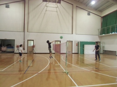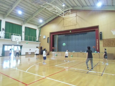 なわとびで体をならした後、3、4人でパスをまわし、何回続いたかを数えました。