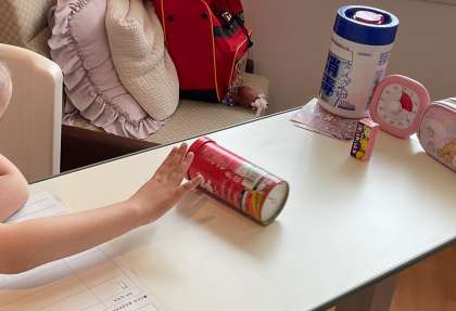 筒状の空き箱を見て「これは転がしてあそべるんじゃない?」という発言から、指導者と的倒しゲームをしました。
