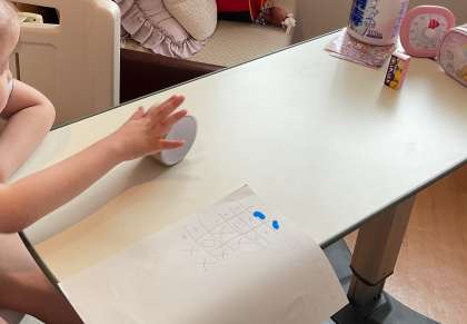 また、「これは・・・積む?」と箱を手に考えていたので、指導者が「いっぱい積んだほうが勝ち?高く積んだほうが勝ち?」と投げかけると、「高く積んだほうにしよう!勝負しよう!」とどちらが高く積めるかというゲームもしました。