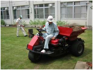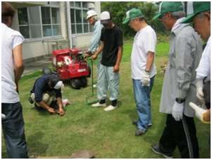 『NPO芝生スクール京都』の校庭芝生化整備事業で,細見吉郎NPO芝生スクール京都理事長をはじめ,NPOの方々や業者の方々による芝生更新作業が行われました。
